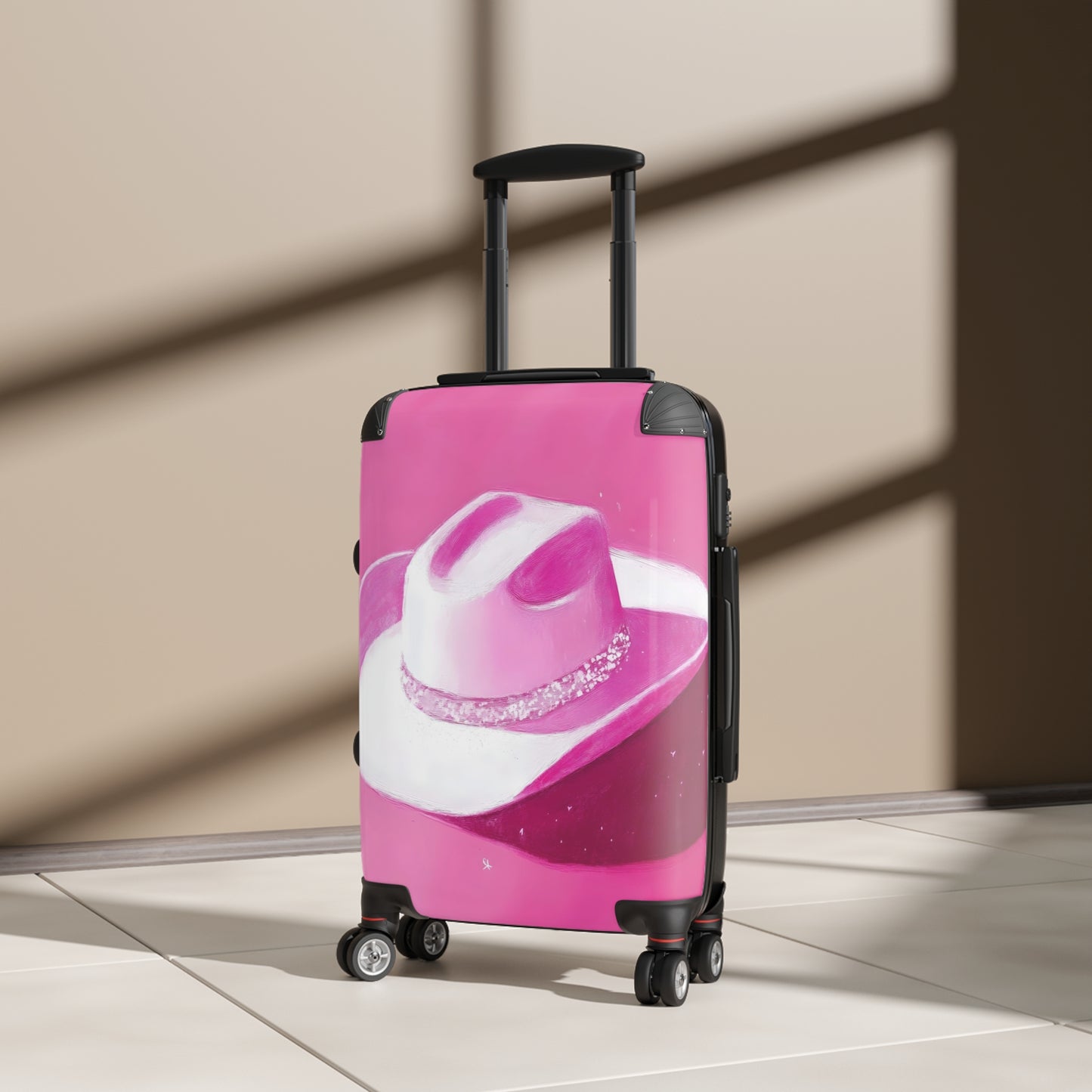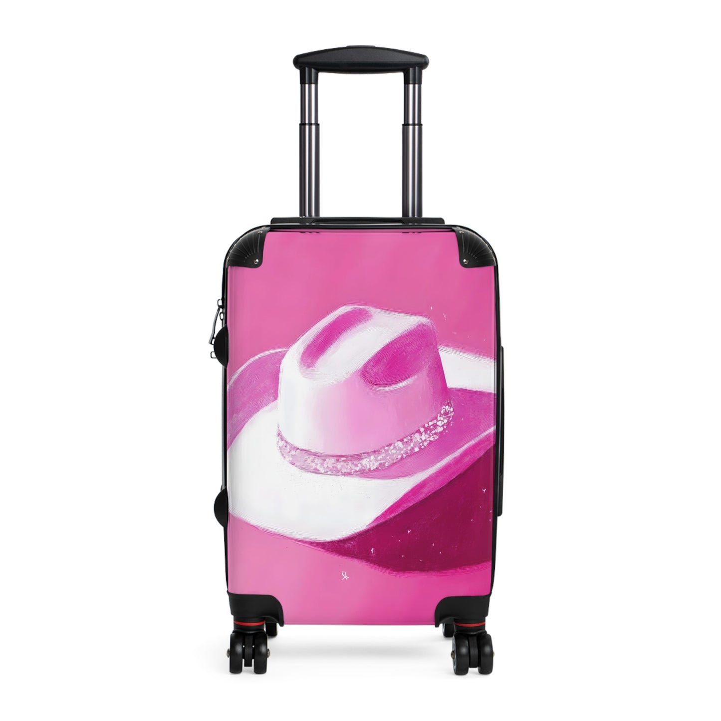 This White Cowboy Hat suitcase is a hot, girly choice for the adventurous traveler. With its bold pink background and eclectic design, it's sure to stand out on any journey. Transport your belongings in style and show off your daring side with the Hot Girly White Cowboy Hat on Pink Background Suitcase.