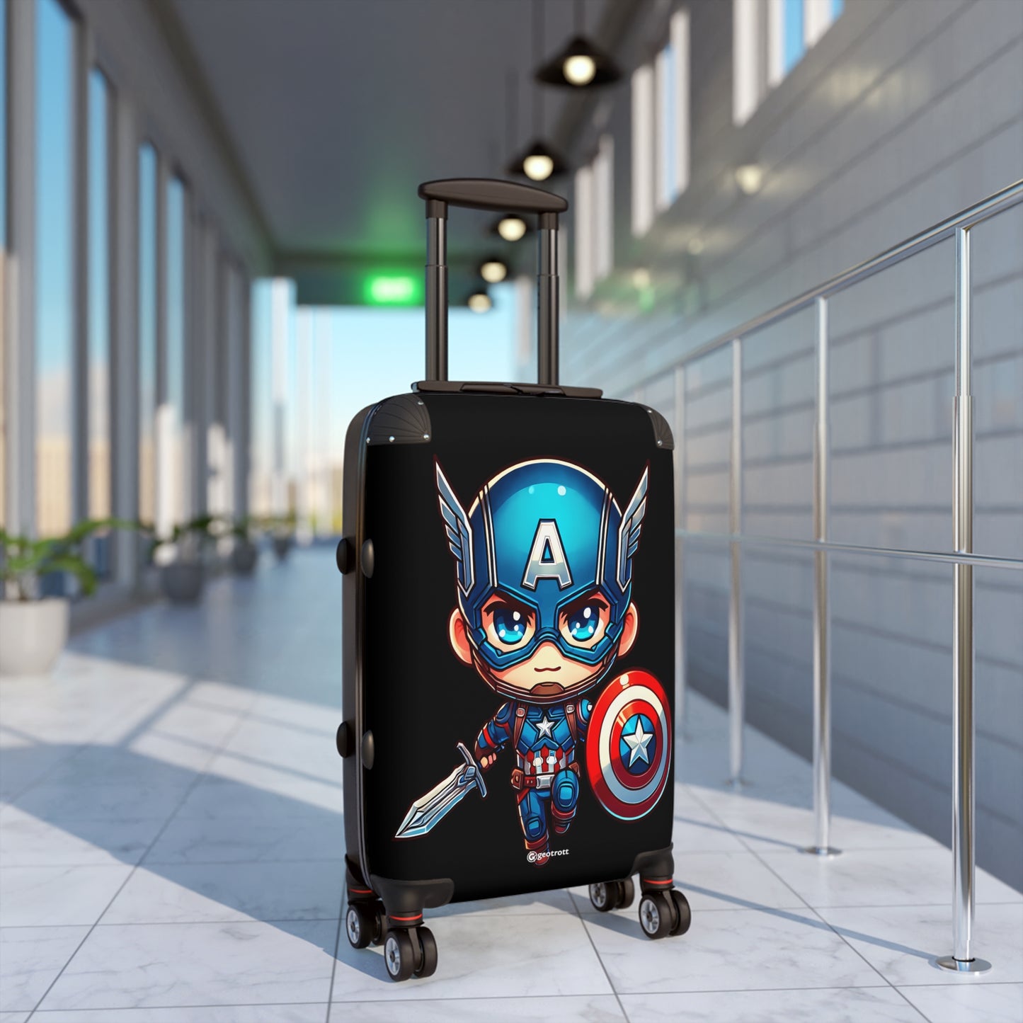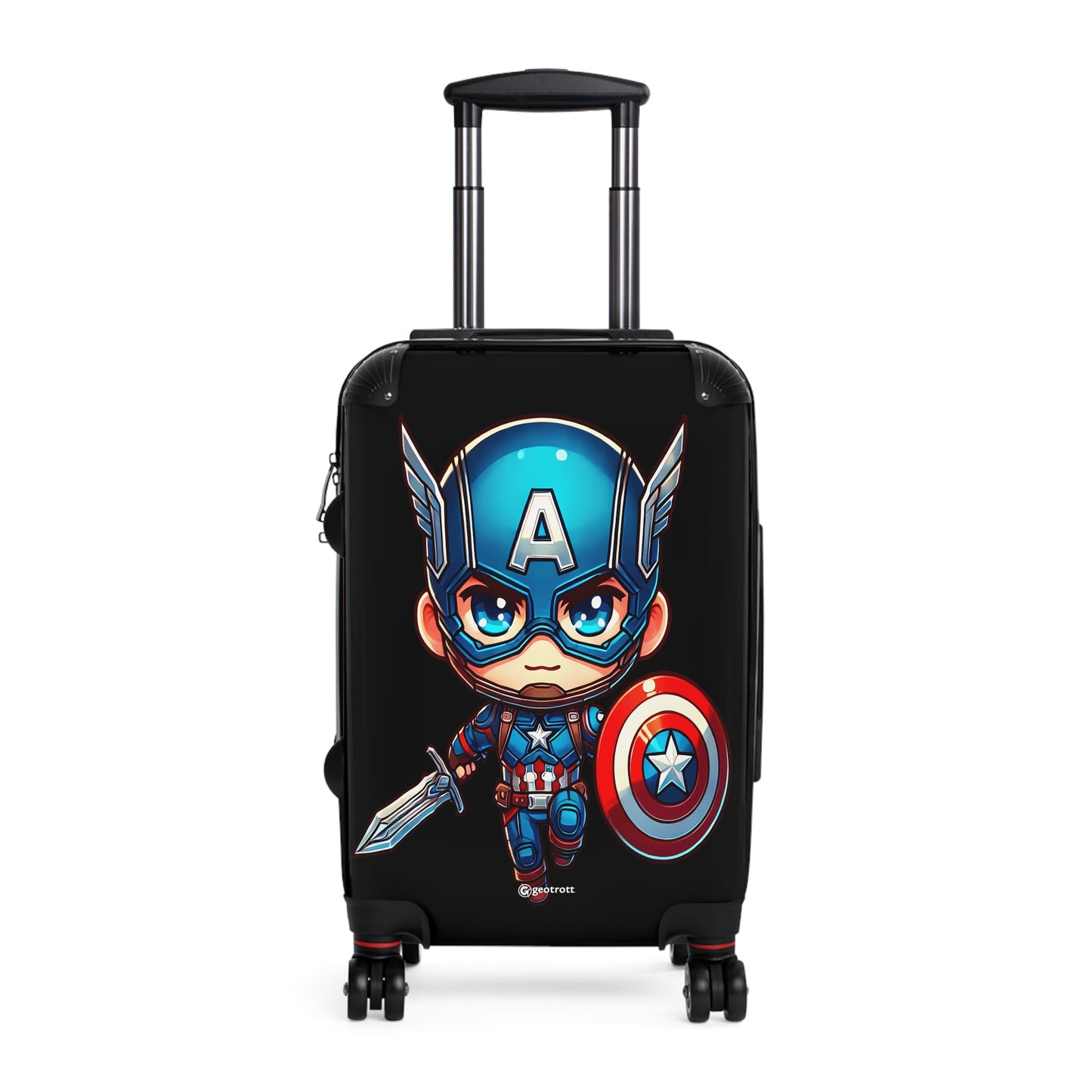 This image showcases a charming chibi-style rendition of Captain America, the iconic Marvel superhero. The character is depicted with an oversized head featuring large, expressive blue eyes and a determined expression. He wears his signature blue helmet adorned with an "A" and wings, as well as his classic red, white, and blue costume. The miniature Captain America holds his famous vibranium shield, emblazoned with a white star on a red and blue background, and wields a sword in his other hand. This cute, cartoonish interpretation of the patriotic Avenger captures the essence of the character in a playful, appealing style that would delight fans of both Marvel Comics and chibi art.