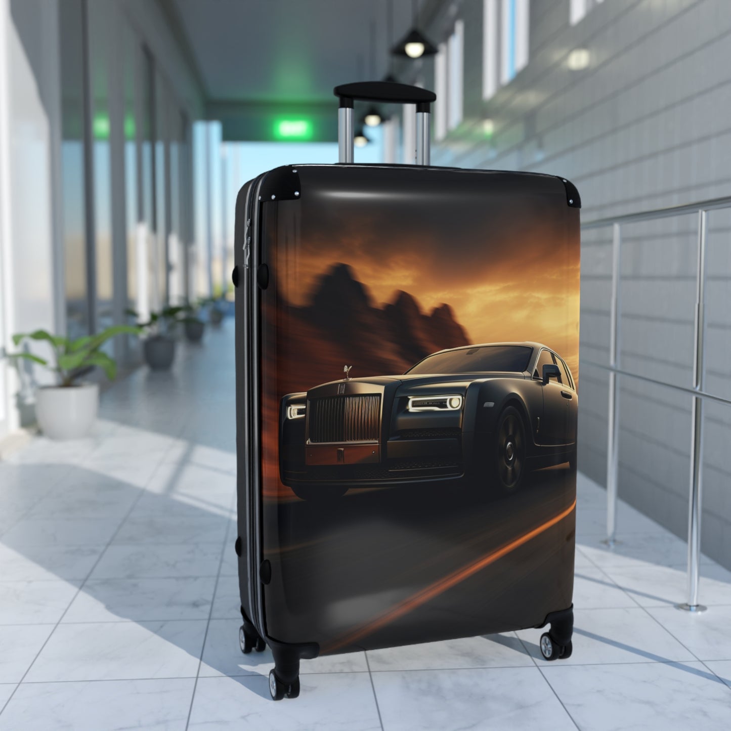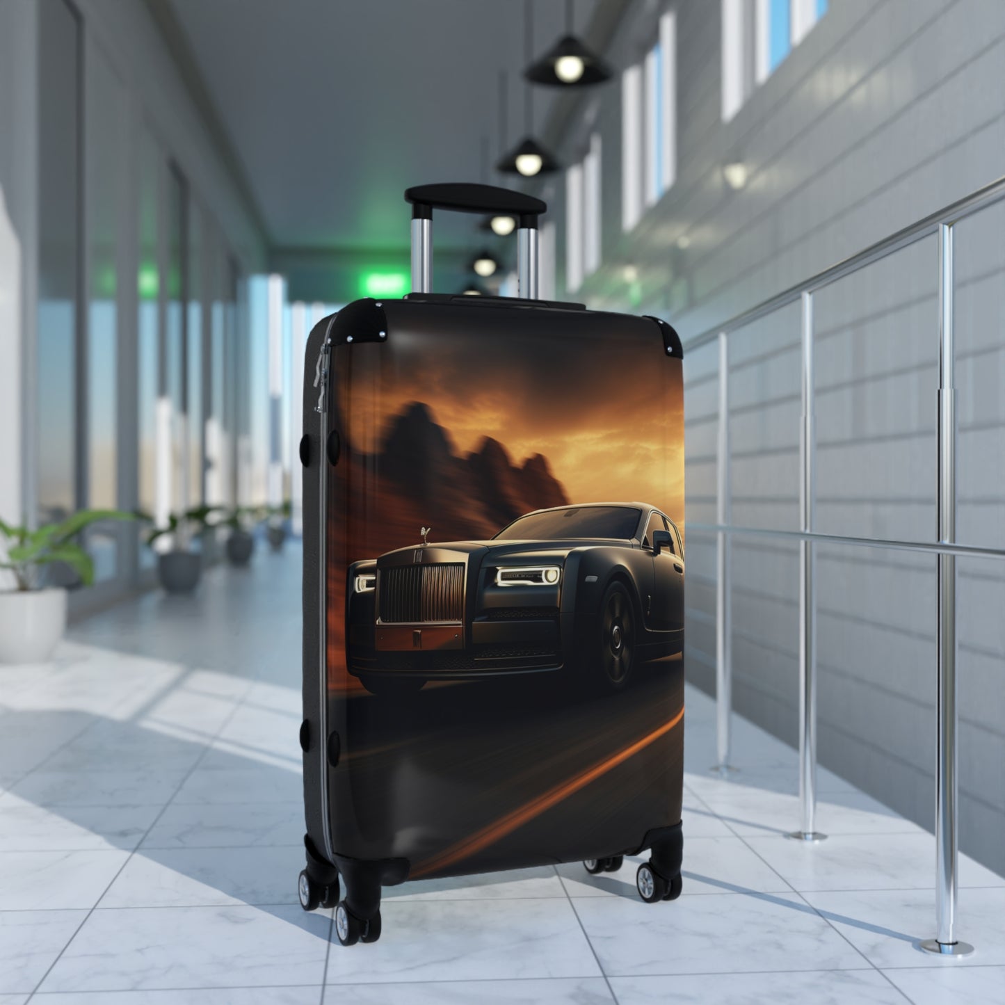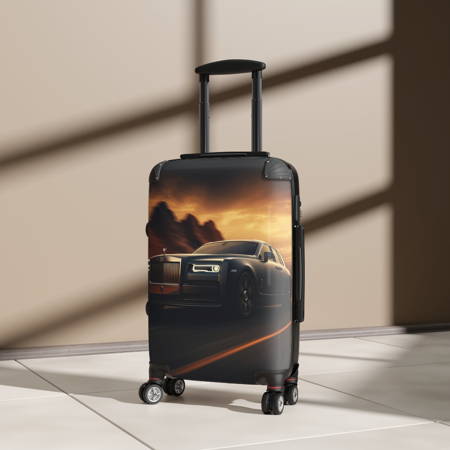 This stunning image showcases a luxurious Rolls-Royce Phantom against a dramatic desert sunset backdrop. The sleek, dark-colored vehicle dominates the foreground, its iconic grille and Spirit of Ecstasy hood ornament gleaming in the fading light. The car's elegant silhouette is accentuated by the warm, golden hues of the sky, with ominous storm clouds looming in the distance. The scene exudes opulence and adventure, as the high-end automobile appears to glide effortlessly along a desert road, its headlights piercing the approaching dusk. This captivating photograph perfectly encapsulates the allure and prestige associated with the Rolls-Royce brand, while also evoking a sense of wanderlust and exploration.