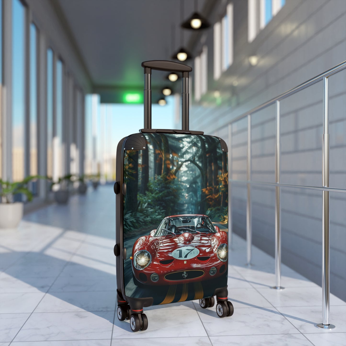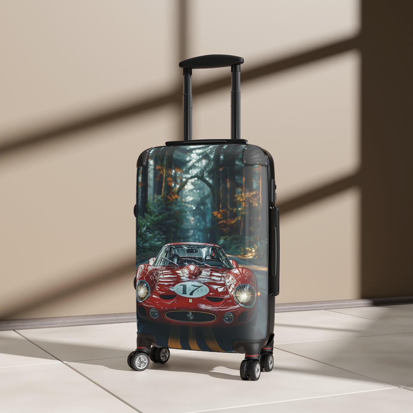This stunning image captures a classic Ferrari racing car, likely a 250 GTO, speeding through a misty forest road. The vibrant red paint of the sleek, curvaceous body gleams against the backdrop of towering trees with golden autumn foliage. The car's iconic design features round headlights, a prominent front grille with the Ferrari prancing horse logo, and the number 17 emblazoned on its hood. The scene exudes a sense of speed and adventure, with the car's motion blur contrasting sharply against the ethereal, dream-like quality of the forest. This captivating blend of vintage automotive beauty and natural splendor creates a striking visual that would appeal to car enthusiasts, nature lovers, and photography aficionados alike.