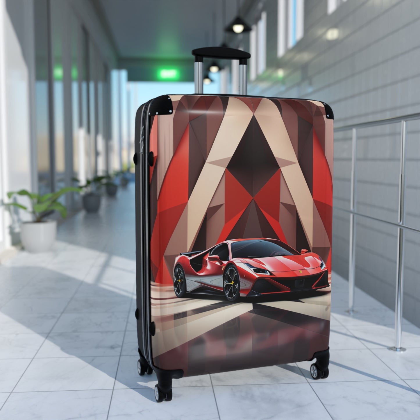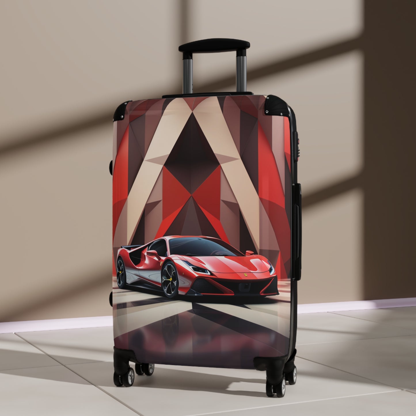 This striking image showcases a sleek Ferrari supercar in vibrant red and silver, set against a dramatic geometric backdrop. The vehicle, likely a Ferrari SF90 Stradale or similar model, dominates the foreground with its aerodynamic curves and aggressive stance. Behind it, a bold abstract pattern of triangular shapes in shades of red, burgundy, and cream creates a dynamic visual contrast. The glossy floor reflects the car and background, adding depth to the composition. This artful automotive photography combines cutting-edge design with artistic flair, perfectly capturing the essence of luxury, speed, and Italian craftsmanship that Ferrari is renowned for.