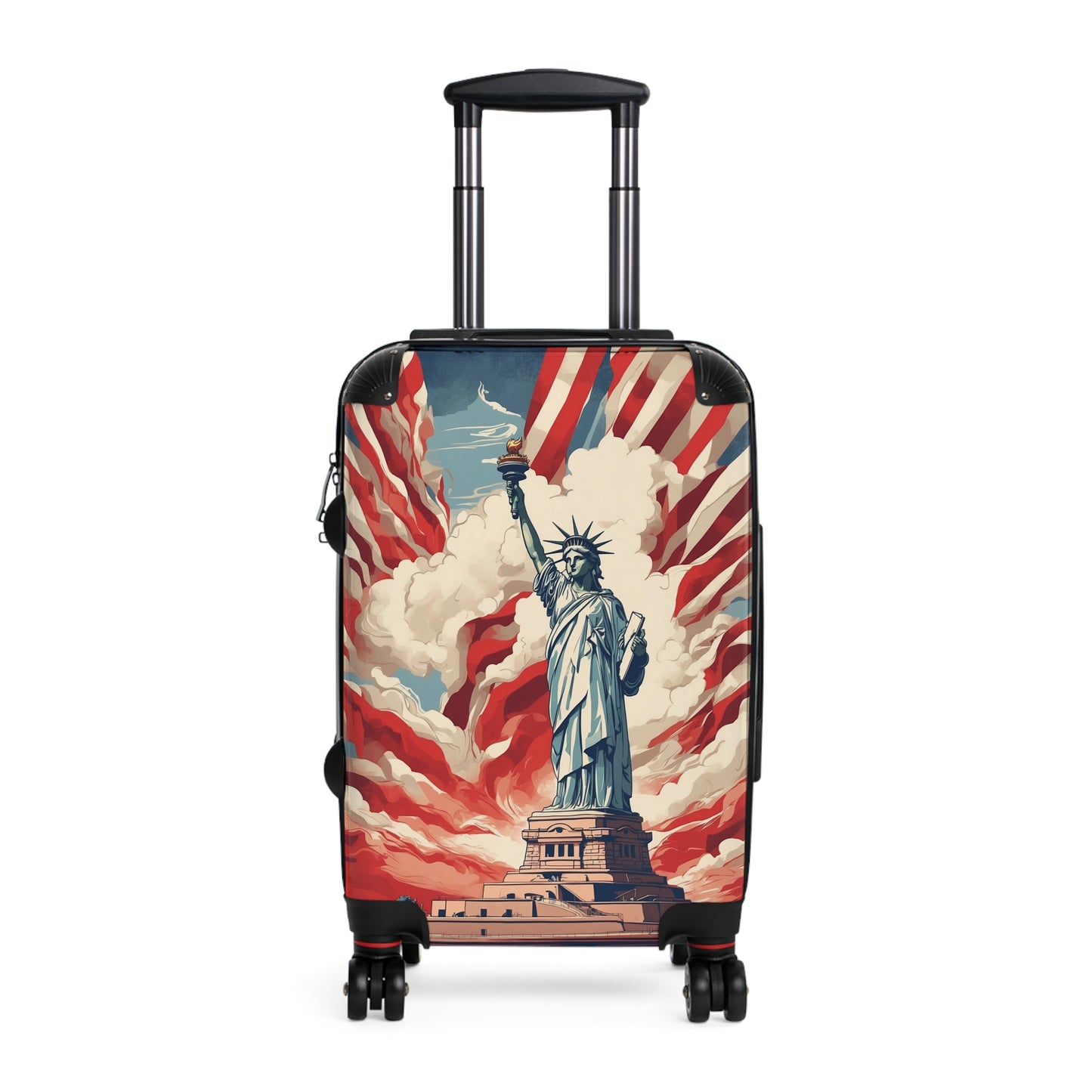 This striking patriotic image showcases the iconic Statue of Liberty against a dramatic backdrop of red, white, and blue. The statue stands tall and proud on Liberty Island, surrounded by swirling clouds and vibrant stripes reminiscent of the American flag. The artwork's bold, graphic style evokes vintage propaganda posters, with a modern twist. The statue's torch burns brightly, symbolizing hope and freedom, while the word "USA" is prominently displayed in the upper right corner. This powerful visual representation of American ideals and symbolism would make an excellent addition to any patriotic-themed content or discussion about American landmarks and national identity.