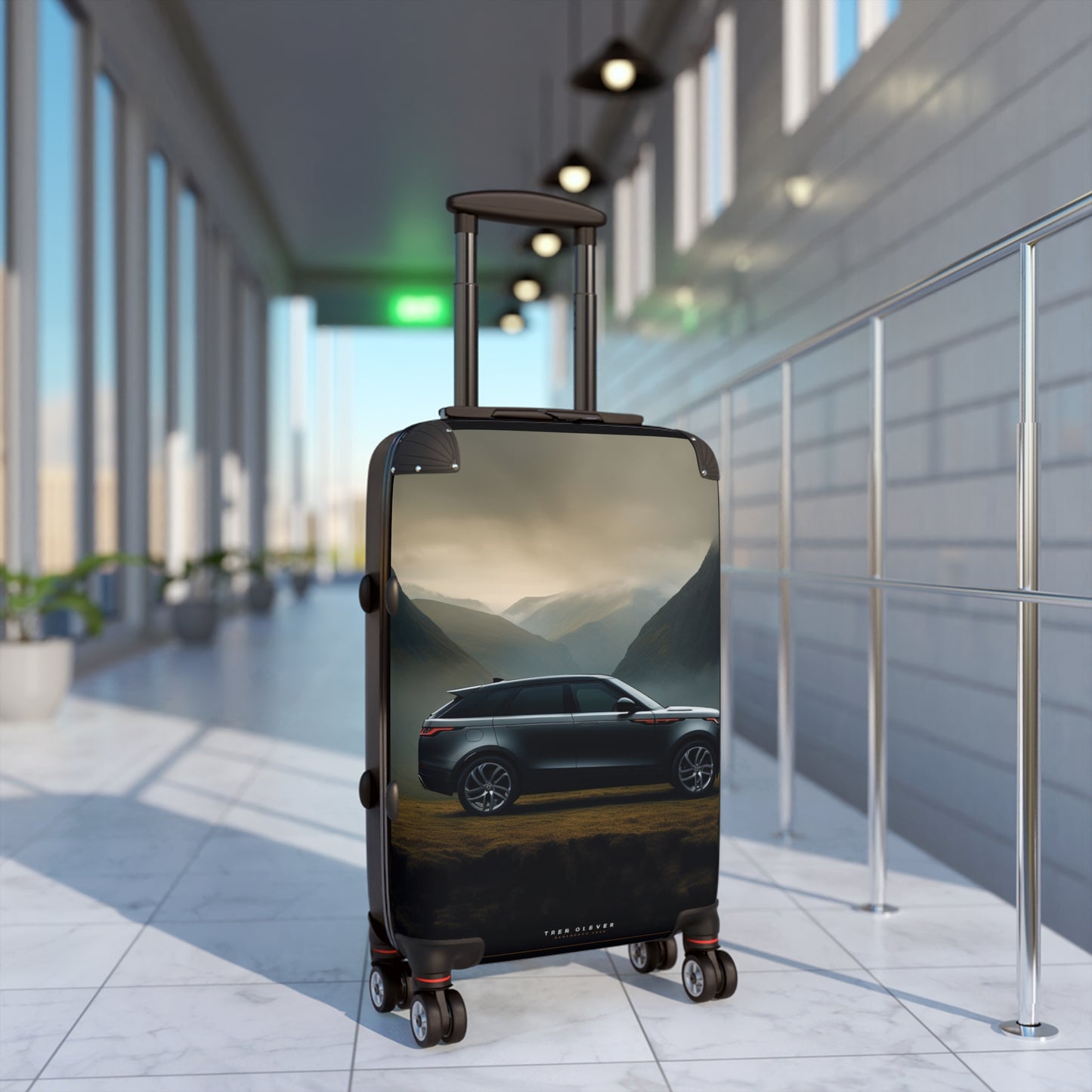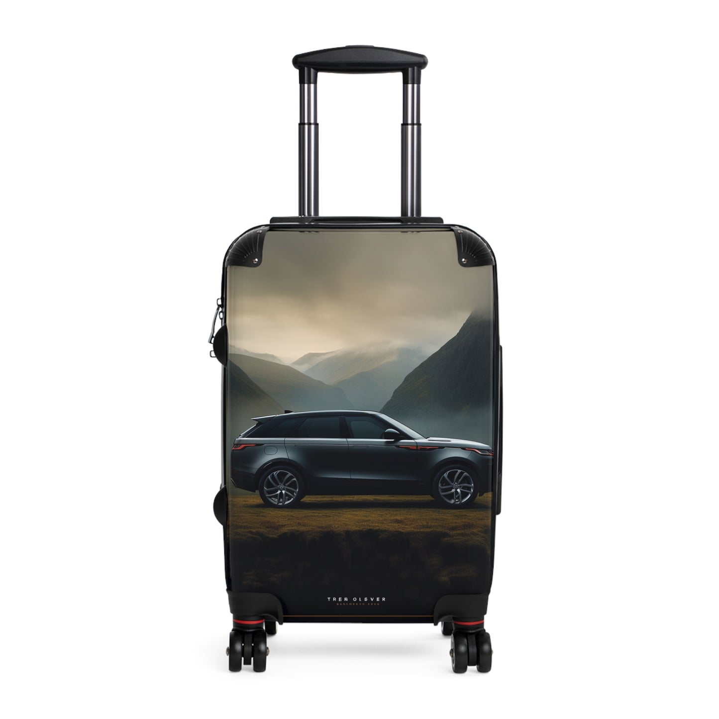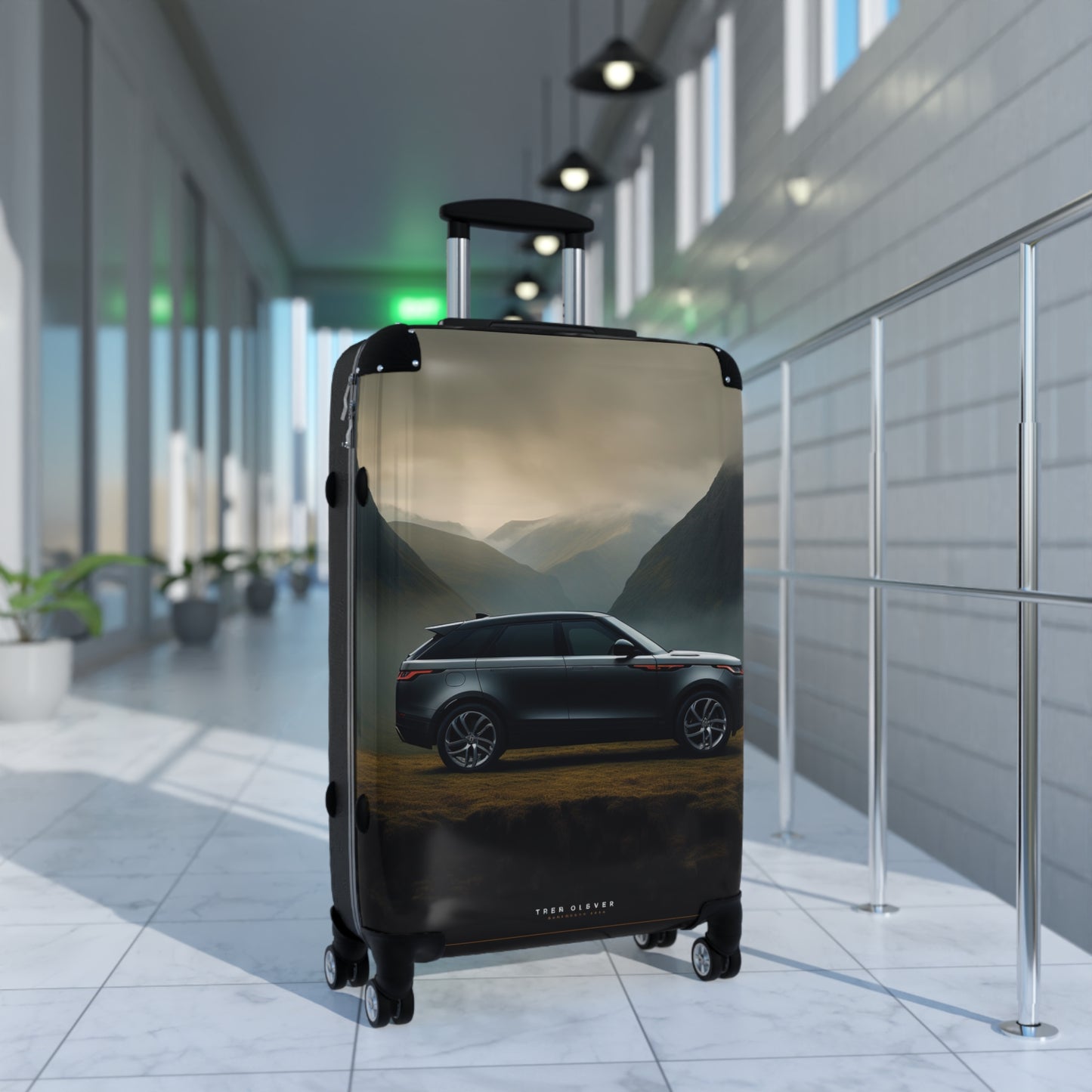 This stunning image showcases a sleek, dark-colored luxury SUV set against a breathtaking mountainous backdrop. The vehicle, likely a Range Rover Velar, stands out with its elegant profile and stylish design elements, including distinctive LED headlights and taillights. The misty, atmospheric scenery features towering peaks shrouded in fog, creating a dramatic and moody ambiance. The contrast between the modern, high-tech automobile and the rugged, natural landscape emphasizes the vehicle's capability and versatility. Golden light filtering through the clouds adds warmth to the scene, highlighting the car's smooth lines and polished surfaces. This captivating automotive photography masterfully combines the allure of cutting-edge design with the raw beauty of nature, making it an ideal representation of adventure and sophistication in the luxury SUV market.