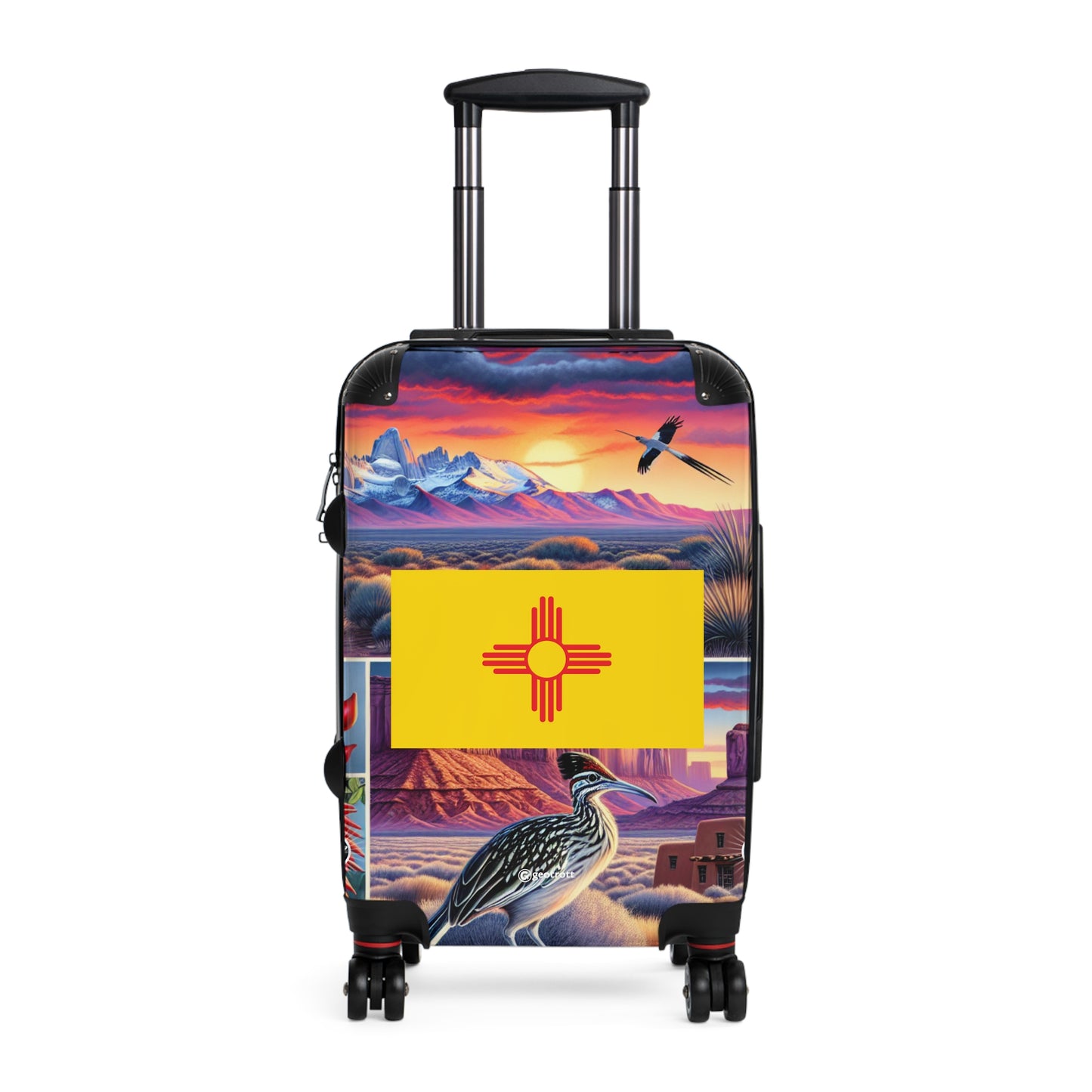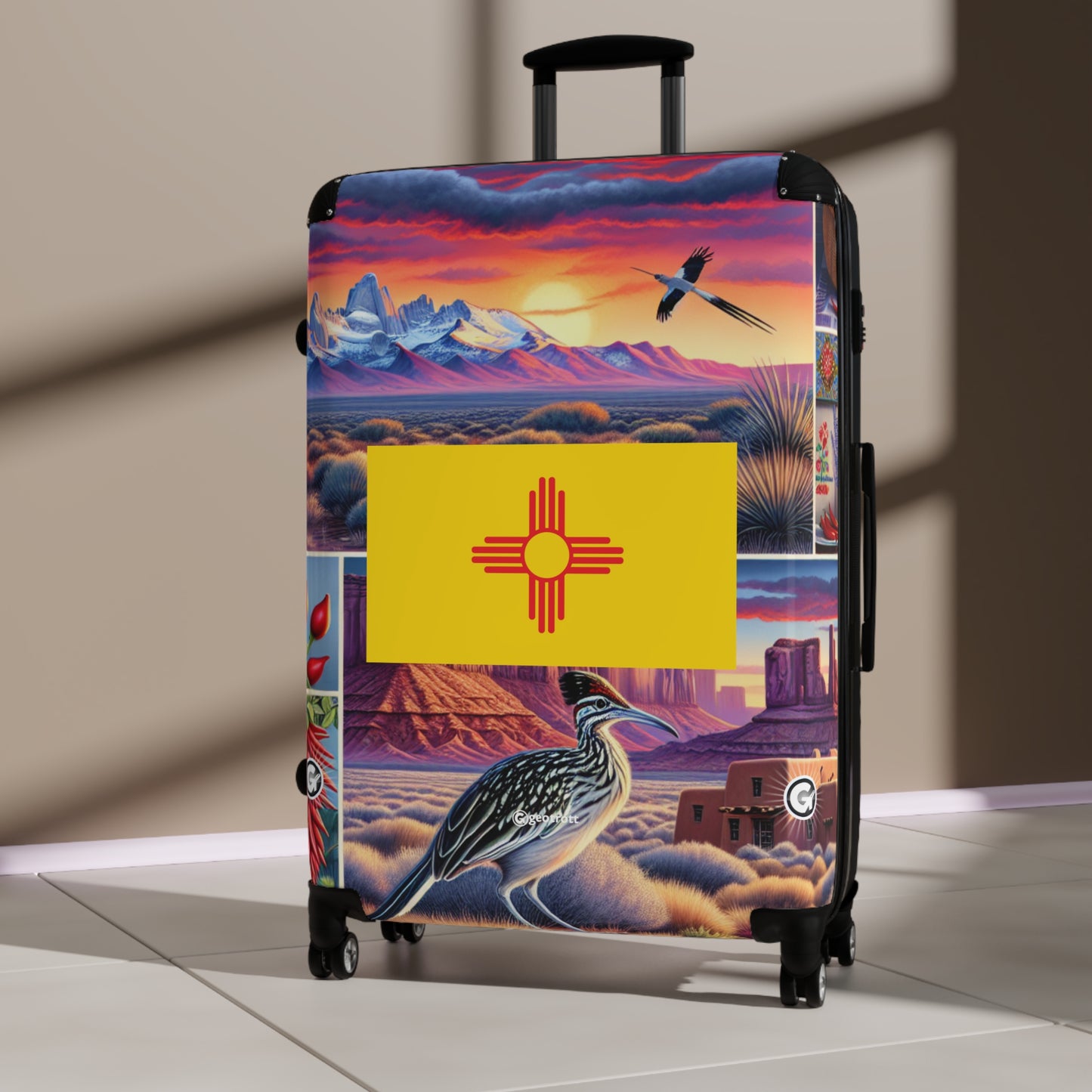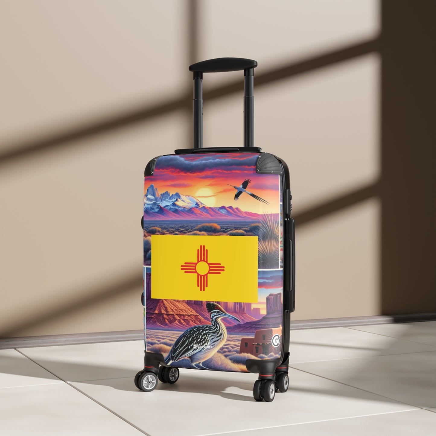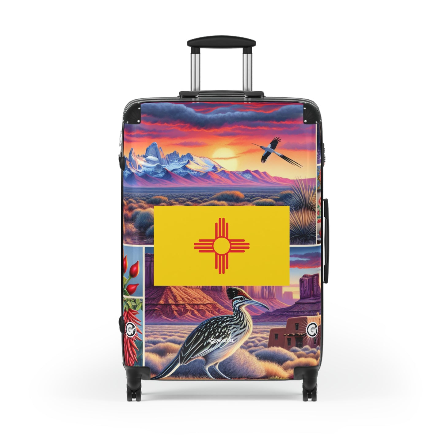 Whether you’re cruisin’ down Route 66, hittin’ up the Balloon Fiesta, or just jet-settin’ like a boss, this New Mexico State Flag Rolling Suitcase is straight fuego! Show off that bold Zia sun symbol with a vibrant artistic twist, reppin’ the Land of Enchantment wherever you go.