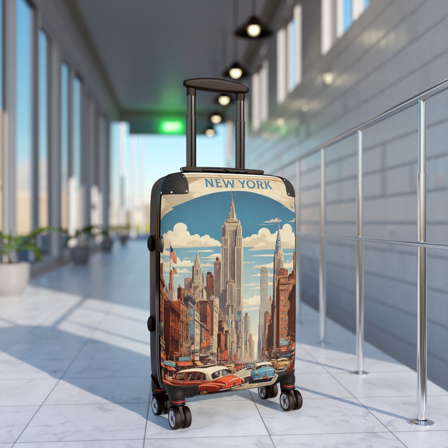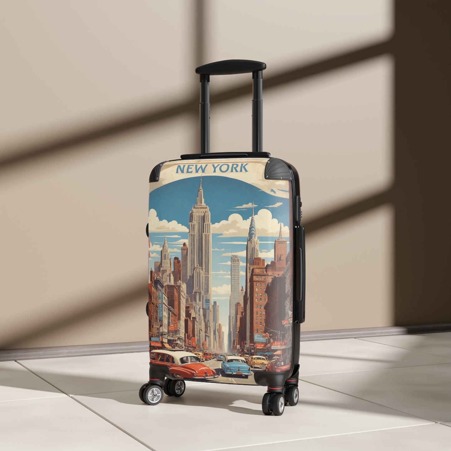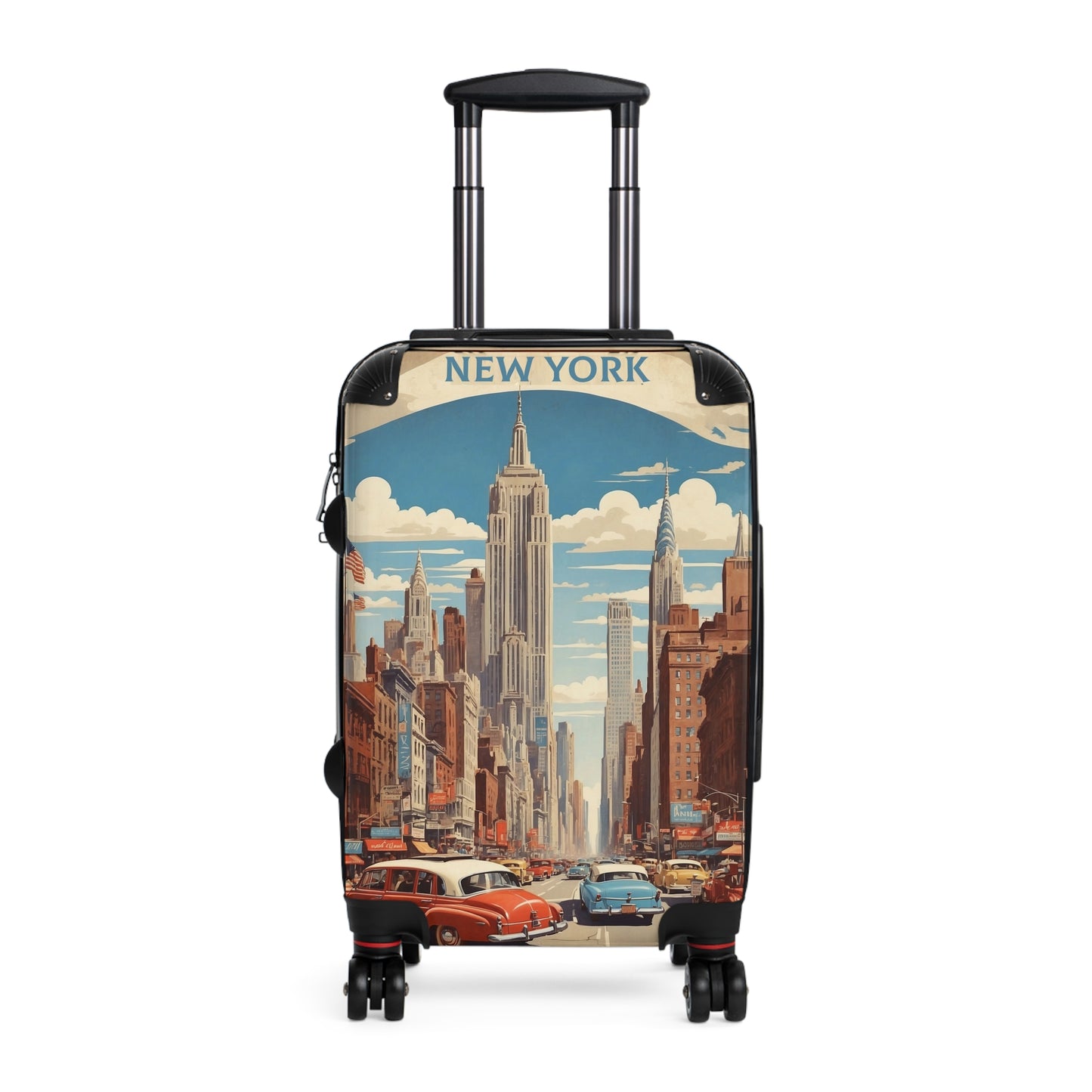 This vintage-style travel poster showcases the iconic New York City skyline, dominated by the Empire State Building at its center. The bustling street scene depicts classic 1950s-era cars in vibrant colors, driving down a busy avenue lined with brownstone buildings and storefronts. American flags flutter in the breeze, while the Chrysler Building and other skyscrapers punctuate the background against a bright blue sky dotted with fluffy white clouds. The poster captures the energy and grandeur of mid-20th century Manhattan, with its blend of Art Deco architecture, vintage automobiles, and the promise of big city excitement. Rich in detail and nostalgia, this illustration perfectly encapsulates the allure of New York as a premier tourist destination during America's golden age of travel.
