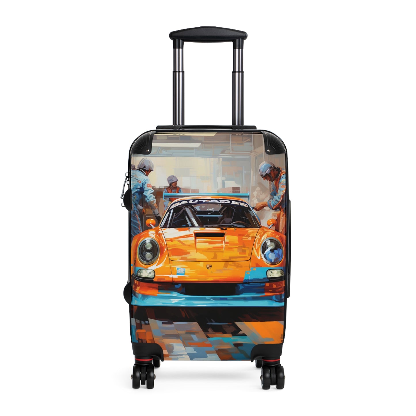 This vibrant image showcases a striking orange Porsche race car being serviced in a pit garage. The sleek vehicle, adorned with "AUTADEC" branding and a prominent rear spoiler, takes center stage as three pit crew members in light blue uniforms and white helmets work diligently around it. The scene captures the essence of high-performance motorsport preparation, with the gleaming car contrasting beautifully against the industrial backdrop of the garage. Reflections on the polished floor and the interplay of warm and cool tones create a dynamic, almost painterly quality to the composition, emphasizing the blend of artistry and engineering that defines professional racing.