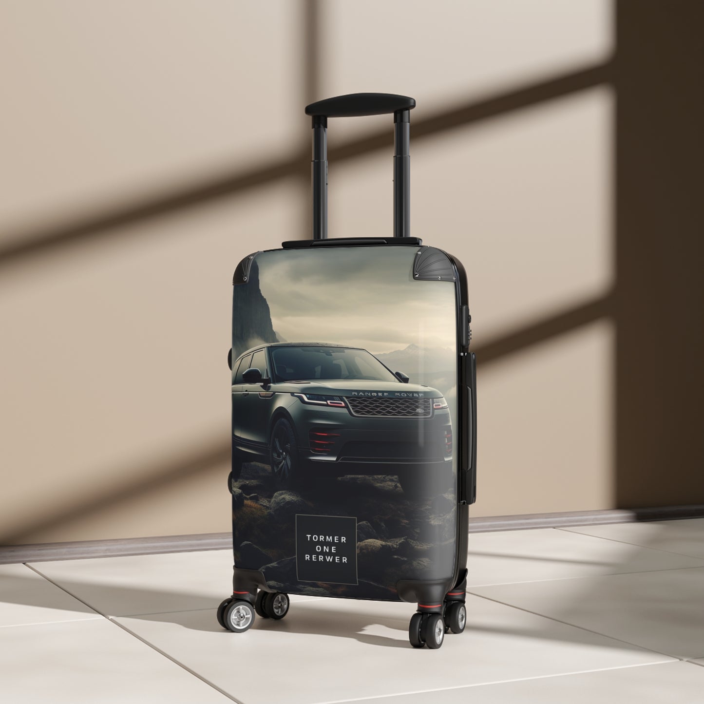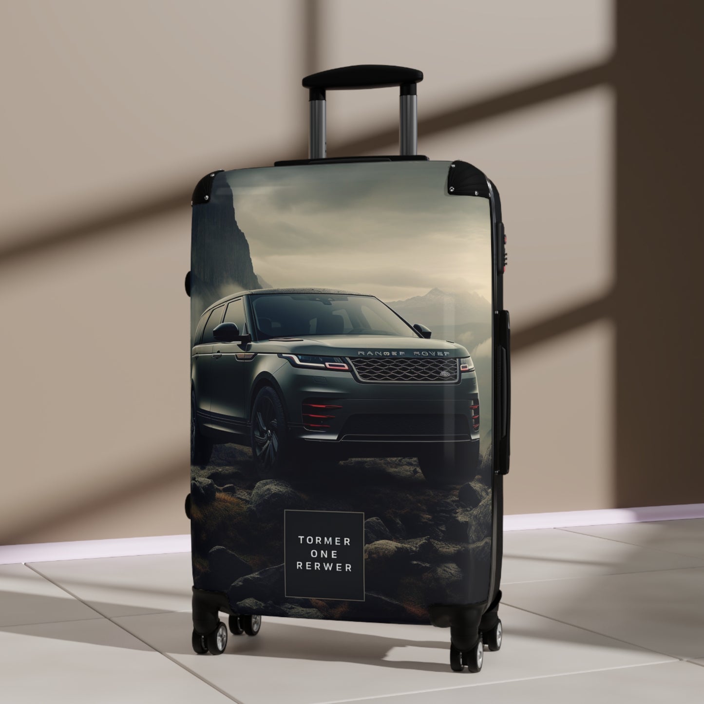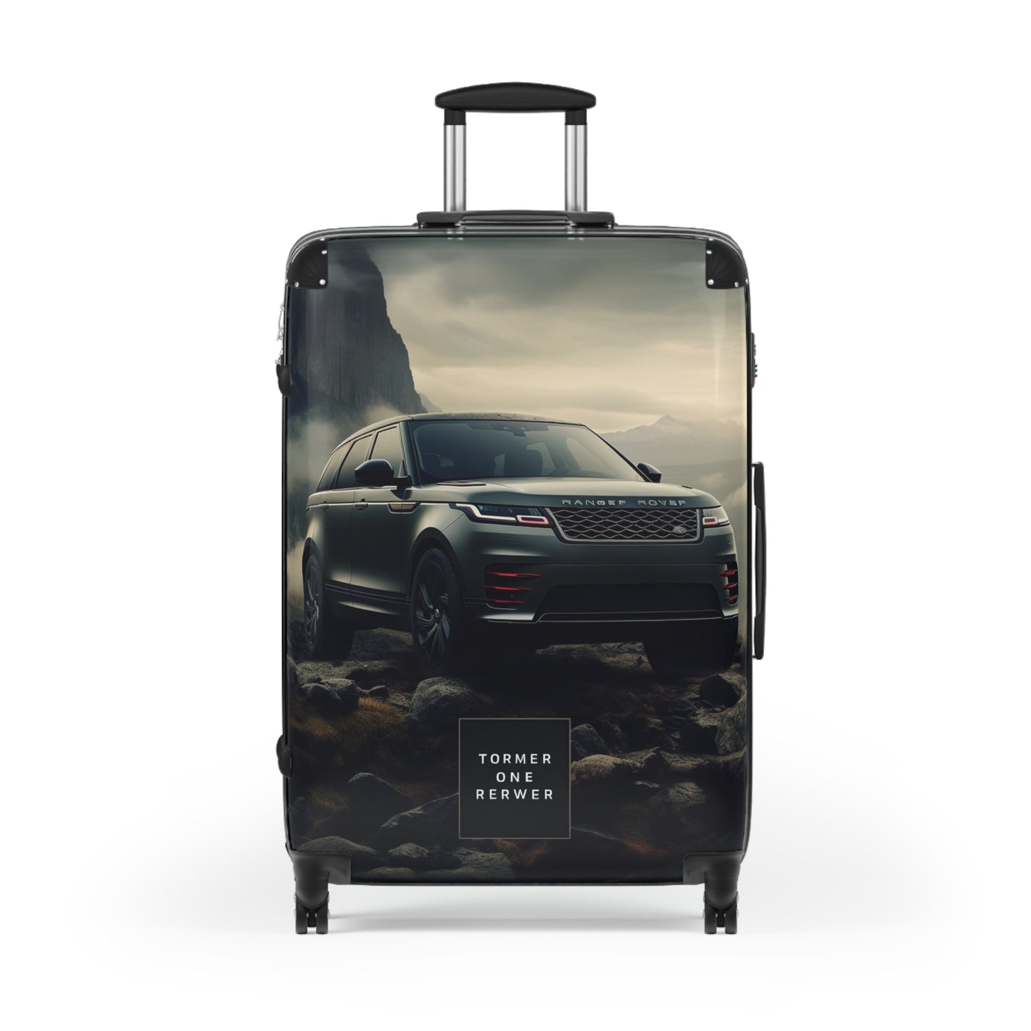 This striking image showcases a Range Rover SUV in a dramatic, misty mountain landscape. The sleek, dark-colored vehicle stands out against a backdrop of towering cliffs, waterfalls, and rocky terrain. The moody atmosphere is enhanced by low-hanging clouds and a brooding sky, creating a sense of adventure and rugged luxury. The Range Rover's distinctive grille, LED headlights, and aerodynamic silhouette are prominently displayed, emphasizing its powerful presence in this challenging environment. At the bottom of the image, a mysterious text box reads "TORMER ONE RERWER," adding an intriguing element to the overall composition. This visually stunning advertisement effectively conveys the Range Rover's ability to conquer harsh terrains while maintaining its sophisticated design and premium status.