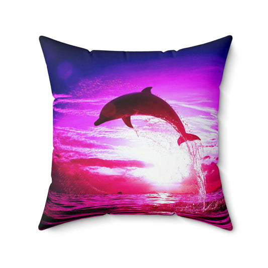 海豚梦飞跃水溅粉紫白纺涤纶方形枕头