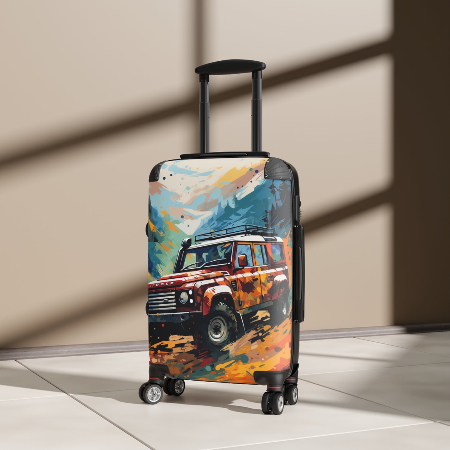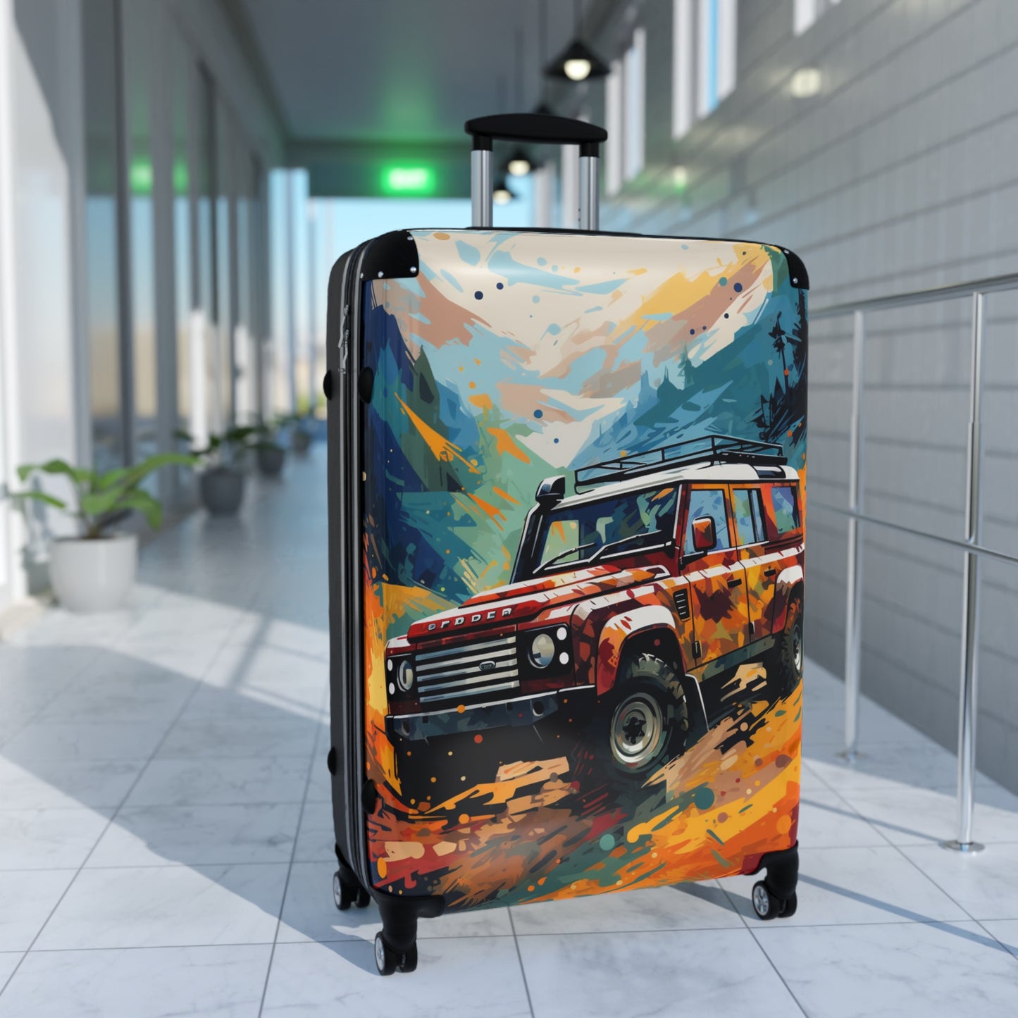 This vibrant digital artwork showcases a rugged Land Rover Defender conquering a dramatic mountain landscape. The iconic off-road vehicle, painted in bold red and orange hues, takes center stage against a backdrop of towering blue mountains and a colorful, abstract sky. The image captures the essence of adventure and exploration, with the Defender's sturdy frame and roof rack ready for any terrain. The artist's use of splattered paint effects and dynamic brushstrokes creates a sense of motion and energy, emphasizing the vehicle's power and capability. This eye-catching illustration would appeal to outdoor enthusiasts, car lovers, and art aficionados alike, perfectly encapsulating the spirit of off-road adventure and the timeless appeal of the Land Rover Defender.